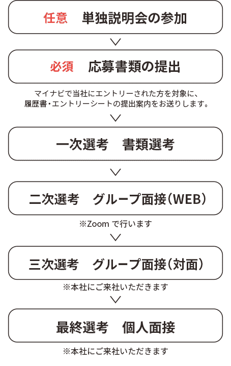 提出先住所:〒700-0945 岡山市南区新保 660-15 採用担当 川崎行 ※履歴書は A3 サイズ、エントリーシートは A4 サイズで印刷したものをご使用ください。 ※〆切日を必着とさせていただきます。 |