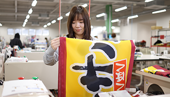 のぼり旗や幕など自社で取り扱う商品の印刷を行っています。複数商品の製造・工程を管理し、印刷可能な新たな商材の提案・調査も行います。1つ1つ心を込めて制作しています。